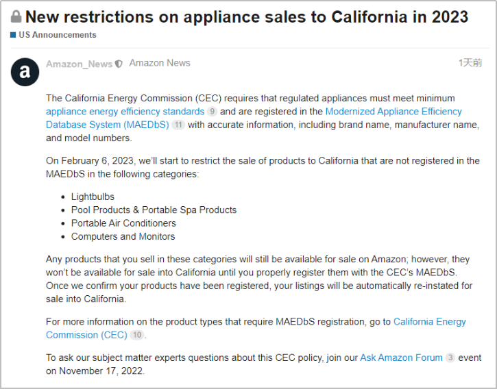 美國亞馬遜實施CEC Title20 強制能效認證